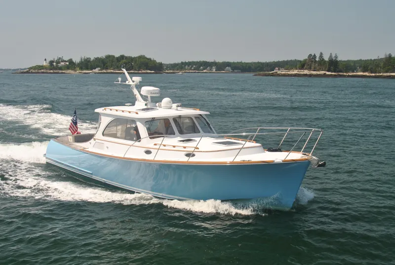 ELISE is arguably the most versatile Hinckley Talaria 40 on the water. Her prior Owner, an avid fisherman, wanted a great-looking, refined Downeast-style boat that would be as comfortable entertaining family and friends as it would be raising fish offshore. In 2012, with the help of Rhode Island naval architect Mathew Smith, in-person Volvo Penta engineering, and Hank Hinckley, he set out to transform a well-loved T40 by replacing the standard jet propulsion system with the latest and greatest Volvo IPS drive propulsion system. The result is a transformation that tracks better, turns better, and has a more efficient midrange cruise than her jet-powered counterparts. She can also dynamically position herself (GPS Lat/Long) in one spot at the push of a button, a feature not only handy around the docks, but also while waiting for bridges, or watching an up-wind mark rounding during a sailing race. The further addition of outriggers (removable), rod holders, a baitwell, and a slightly modified cockpit allows for refined fishability not found in many boats.