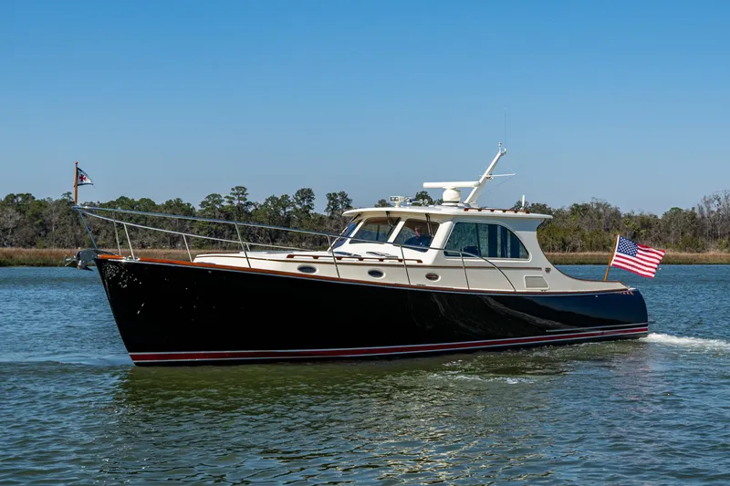 - Tapered, varnished teak toe rail with Hinckley profile and varnished teak trim.