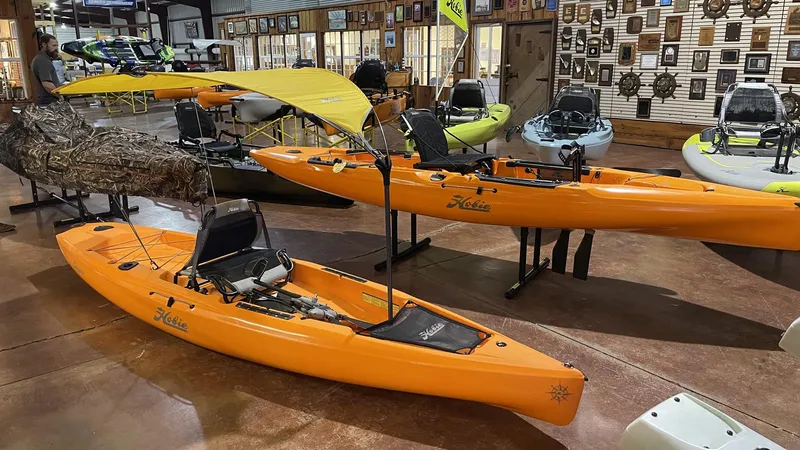 New 2022 Hobie Mirage Compass in stock. Color Papaya Orange.Up to 25% Off and Layaway Available Thru 12/20/2025. 800-I'M READY. 1-800-467-3239.The Hobie Mirage Compass Sit-On-Top Pedal Kayak is perfect for anglers looking for a kayak that can maneuver in tight quarters, yet still has the speed to cover open water. This kayak comes with pre-installed rod holders and H-Track accessory mounts, making it easier than ever to set up your fishing gear. The transducer cavity is ready for you to install a Lowrance fishfinder, so you can easily find the fish while you're out on the water. Whether you're an experienced angler or just getting started, the Hobie Mirage Compass Sit-On-Top Pedal Kayak is the perfect choice for your next adventure.Compass Camo comes with the MirageDrive 180 with Turbo Kick-Up Fins.SpecsCrew: 1 PersonDrive: MirageDrive 180 with Kick-Up Fins (Camo comes with Kick-Up Turbo Fins)Length: 12'Width: 34'Capacity: 400 lbsSeat Capacity: 275 lbsFitted Hull Weight: 68 lbsFully Rigged Weight: 87 lbsHull Construction: Rotomolded PolyethyleneHeight From Floor To Middle of The Kayak: 12.5'Height From Floor To Tallest Point On The Kayak: 13.5'Bimini not included but available to purchase separately.*****DEMO - We can get you on the water for a demo just about any day, but please call ahead to be sure.*****Whether you get out on the lakes and rivers of Northeast Alabama or travel the country fishing, our line up of fishing kayaks from Hobie and Jackson are some of the best on the market for all conditions. Neely Henry Lake, Weiss Lake, Logan Martin, Lay Lake and even Guntersville are all great bodies of water to kayak fish on in our area. We offer paddles, PFDs and accessories from brands like Bending Branches, YakAttack, NRS, Stohlquist and Hobie. We offer all electronics available on the market, like Humminbird, Lowrance, Garmin, Minn Kota and MotorGuide and batteries like Dakota Lithiums to power them. Contact us today about helping you get your kayak rigged the way you want it.