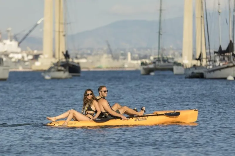 The Hobie Revolution 13 makes a great fishing kayak with its extensive features. The Kick-Up fin feature on its 180 MirageDrive automatically retract upon impact of a submerged object to avoid damage to the fins. Simply begin to peddle again once clear of the object, and the Kick-Up fins begin to function safely and effortlessly.