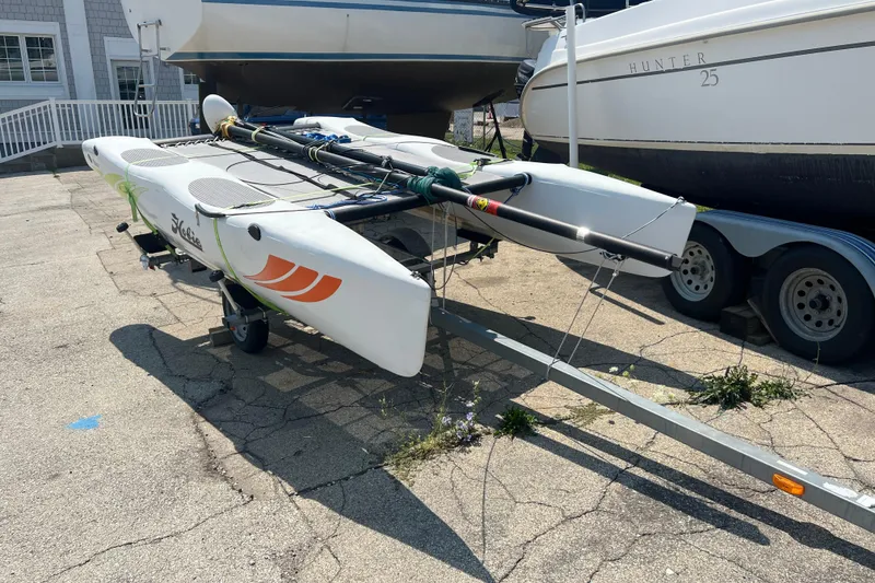 Hobie Cat Wave Specifications - Standard Equipment - Exceptionally durable Roto-molded hulls - Fully-battened Dacron sail with oversized view window - Colored sail - Teal-colored mesh trampoline with heat welded seams for strength and durability - Mast flotation device - Comptip mast for safety - Black anodized aluminum - Molded-in padded seat cushions for added comfort - Innovative quick assembly - disassembly design allows easy transporting and storage - Jib kit - Custom trailer - Single trapeze system