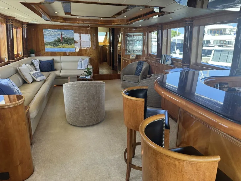 Entered via a dark tinted sliding glass door and is half a step down. Large side deck windows with pleated Duette shades offer lots of ambient lighting. There are (4) windows on each side with burl wood columns between. Immediately to starboard when entering the salon is a two-level Absolute black marble bar with an undermount bar sink. (5) cabinets offer abundant storage. Behind an additional cherry door is a Sub-Zero ‘clear ice’ icemaker. Above the bar angled toward the seating area is a 50” Samsung Smart TV, two barstools with backrests face the bar.