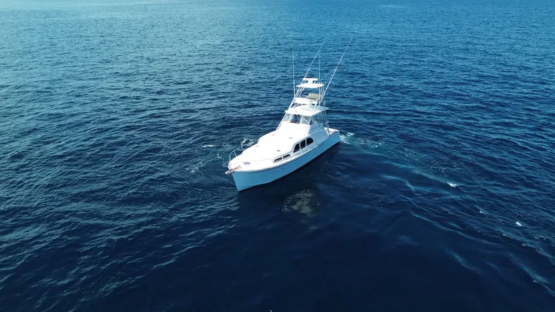 The cockpit is meticulously designed for big game fishing, fully equipped with a livewell, fish preparation stations, refrigeration, and ample cooler space. A swim platform and transom door offer easy water access. Enhancing her capabilities, she's outfitted with outriggers and a tuna tower.