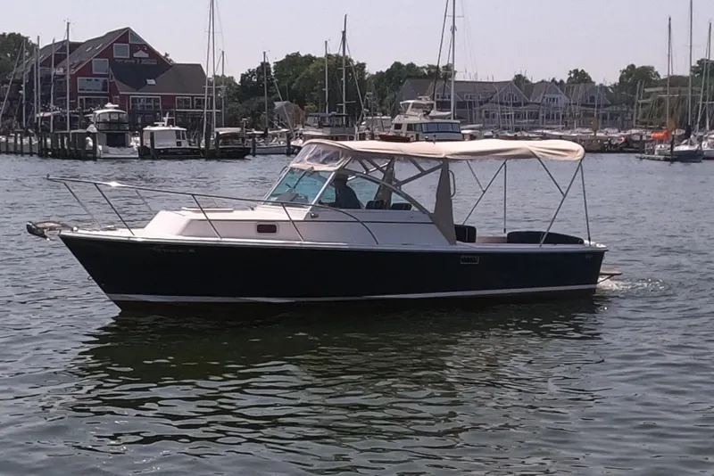 The Hunt Surfhunter 25 is a legend on the nasty, choppy waters of Buzzard's Bay where the summer sou'wester kicks up a short steep chop every afternoon trying to push all the water east of Newport up through the narrow pass of the Cape Cod Canal. The Surf Hunter was designed by Ray Hunt for these waters and originally built here in wood. She has a full 23-degree deadrise deep-V hull with a widely flaring bow to punch through the chop while staying dry.Hunt has added features and improved the cockpit layout by moving the engine forward. This allows space for an optional full-width stern seat or more fishing room with the seat removed. Updated features include: on deck stowage lockers; rod racks recessed under the side decks; a molded console with room for flush-mounted electronics; gas or diesel power; 40 mph speed with a 300 hp economical inboard-outdrive; a roomy cuddy for overnighting including V-berth, toilet, a large opening deck hatch and two portlights with screens, counter space for a stove with locker and drawers, and a vanity with sink and pressure water; low maintenance polyethylene trim above, teak trim below; and a teak trim package for the deck and cockpit is available to complete the classic look if desired.