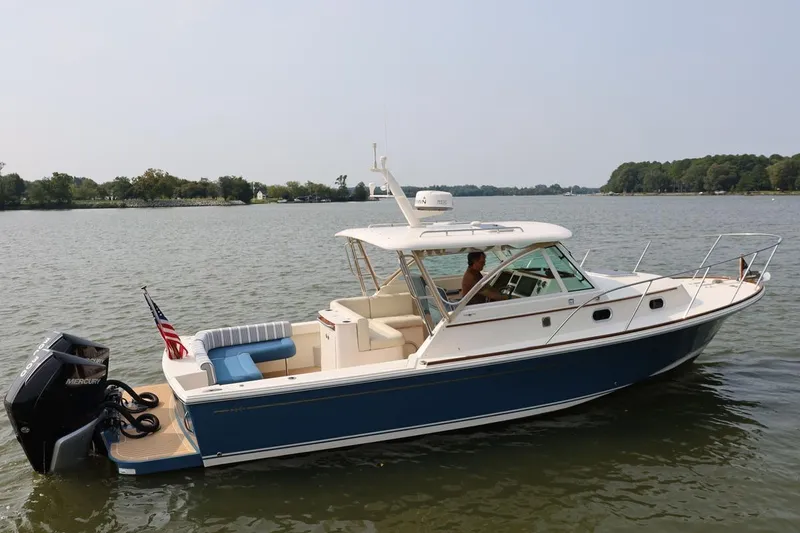 BONHEUR is an outstanding late-model member of the highly regarded class of Surfhunter 32 Express Cruisers designed by Ray Hunt Design and built by Hunt Yachts in Rhode Island. The boat features a pair of desirable and sought-after Mercury Verado V-8 outboard motors paired with a state-of-the-art Mercury joystick control with "Skyhook" for GPS station keeping. With only 120 hours as of September 2025, the motors have just been professionally serviced with compression tests performed to confirm top operating condition. The additional speed available with the outboards is exhilarating and ensures plenty of power is available when bopping around on day trips with a gaggle of family and friends aboard.
