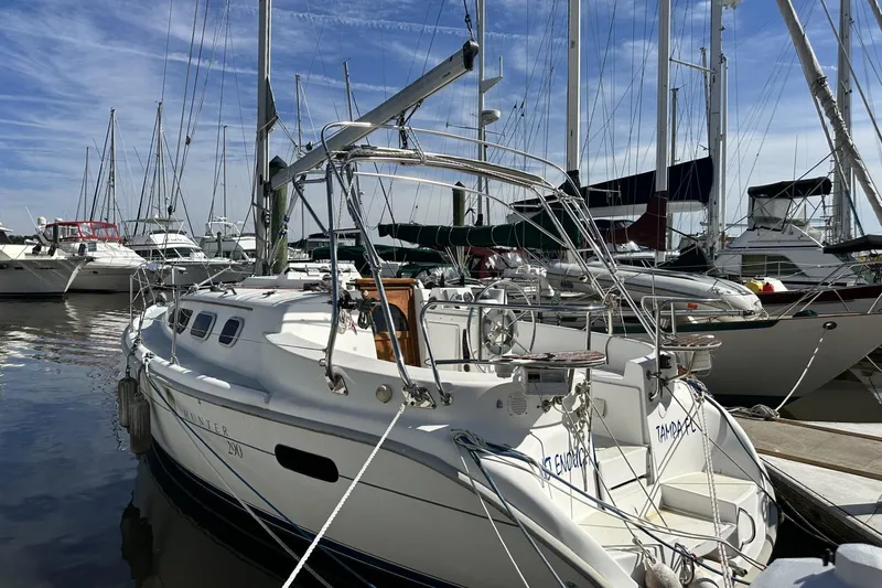 This Hunter 290 is a great cruiser with a wide beam and lots of interior and exterior living space with potential for coastal cruising or even island hopping that's well equipped. Features include amenities not found on larger boats like 6'2" headroom, two private staterooms, navigation station, stand up head with shower, full service galley, large salon with a dinette that converts to a berth, accented with beautiful hardwood and plenty of storage! The diesel sips fuel, and the bridge friendly mast height and shallow draft winged keel allows for exploring places big boats can't go. She performs well on any point of sail, and is very responsive to input from sail trim and helm.