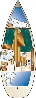 - Private forward cabin with v berth and hanging locker
