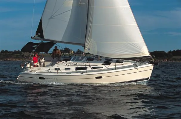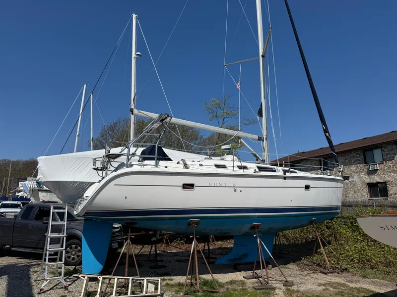 Whether you are ready to set sail for the islands or just around the buoys, the Hunter 36 can really make a difference. Starting with the tall, fractional rig, which is a direct descendent of the B&R rig that powered Hunter's Child to a second place finish in the recent BOC, Hunter has engineered the mast to carry less weight aloft with smaller sections. This is accomplished by utilizing swept-back spreaders and reverse diagonals as well as mast support struts. This combination provides superior strength without a backstay and increases the stability at the same time. By using a large roach main as the power sail, Hunter has eased the effort in sail handling and allowed for real versatility for all wind and sea conditions. Your benefit: better performance with less effort. The deck layout reflects the innovation that accompanies the rig. An integrated arch protects the cockpit from snapping main sheets and blistering sun with the optional bimini. This arch keeps the cockpit clear and open. A custom console stands ready with instruments. Single lever control and fold down table along with engine instrumentation complete the command station. The swim platform and walkthrough transom complete with shower and folding ladder are perfect for water sports or for boarding the tender. Storage is everywhere you look and the non-skid is absolutely first-rate. Comfort is truly important aboard whether for a week or a year, so Hunter has created an interior that not only looks good, but works for you as well. Two private, large staterooms along with an enormous head with shower and a salon that can seat eight plus a gourmet galley will keep all the crew happy.