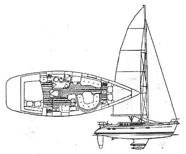 Large triangle berth in forward stateroom with ensuite sink and vanity. Next aft is main salon with large C-shaped settee and gloss finished dinette starboard, straight settee across on port. Further aft is nav station followed by head with stall shower on port and L-shaped galley across starboard. Far aft port side is master stateroom with queen berth set athwartship under the cockpit.