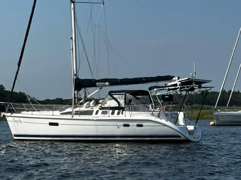 Designed by the Hunter Marine Design Team, this Hunter 410 combines ease of handling with luxurious accommodations, making every voyage a seamless blend of relaxation and adventure. Powered by a Yanmar 4JH3E 50hp diesel engine with 2001 hours, MORNING HAZE delivers reliable performance for your offshore escapades. With a North Sail Mainsail & Genoa, Storm Jib, and a Champion 1000 inverter, you're equipped to tackle any nautical challenge. Whether sailing solo or with friends, the thoughtfully designed cockpit offers versatility and comfort under sail. Set up for easy single-handed sailing, it's also spacious enough to host a gathering. The Dodger, Bimini, and sail cover for the Main ensure you sail in style, rain or shine. Navigate with confidence using the full Raymarine electronics package, including chart plotter, autopilot, wind meter, and radar.