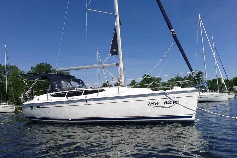 The 2012 Hunter e33 is a 33.5-foot (10.21 m) fractional sloop keelboat with a 11.5-foot (3.51 m) beam, displacing 12,400 lbs (5,625 kg). It features a fixed wing keel, a spade rudder, and a Yanmar 29 hp (upgrade) diesel engine. Key features include a larger cockpit than its predecessor, a fold-down swim platform, horizontal wood grain interiors, and a comfortable cruising layout with two private cabins.