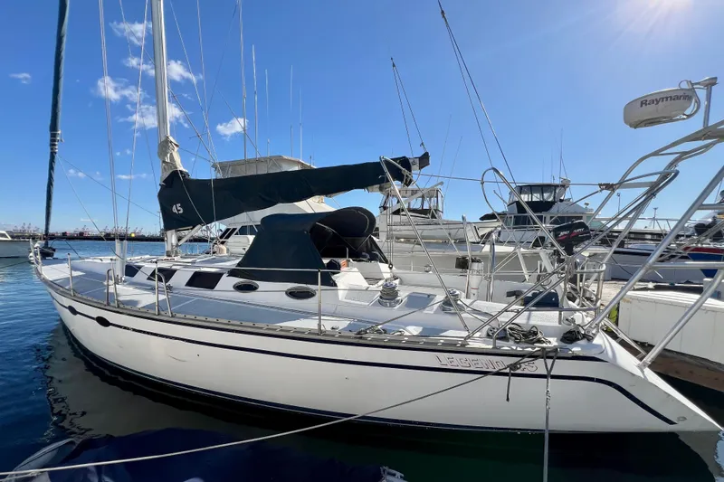 The Hunter Legend 45 is a legendary racer/cruiser that perfectly blends exhilarating performance with exceptional comfort for coastal adventures or extended cruising. Designed by Warren Luhrs and built with Hunter Marine's renowned craftsmanship, this 45-foot fiberglass beauty delivers a spacious, light-filled interior that feels remarkably open and inviting-featuring a true two-stateroom layout with private heads and showers, an expansive U-shaped galley equipped for serious onboard living, and a large, ergonomic cockpit designed for effortless sailing and relaxation. With its innovative B&R rig, stable hull, and proven sailing characteristics, the Hunter Legend 45 offers confident handling, impressive stability, and the freedom to explore new horizons in style and security.