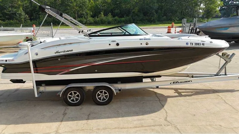 Main Hull Color: Black, Secondary Hull Color: Bright Red, Upholstery Color: White, Carpet Color: Charcoal, Trailer Color: Silver