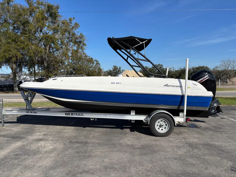2021 Hurricane SS 201 with 2021 Mercury 150 hp fuel injected 4 stroke outboard engine (1127 hrs) with 2021 Nextrail aluminum single axle trailer. Boat includes Ski Arch with Bimini top, Fusion 4 speaker stereo system, Simrad Go5 color screen GPS and depth finder, LED lighting, 4 Blade propeller, swim ladders fore and aft and sea star hydraulic steering. Boat has high hours but was well maintained and you would never know by looking at it. There are a couple small tears in the upholstery where the seems have split but overall upholstery is in excellent condition. Gelcoat is in excellent condition as well. Trailer in excellent condition. Full mechanical inspection performed on engine and passed with flying colors. This boat is an excellent deal. Available at Total Boat Center LLC in Trenton Fl. Financing Available. Ask for Clayton! "Get your ship together at total boat center LLC"