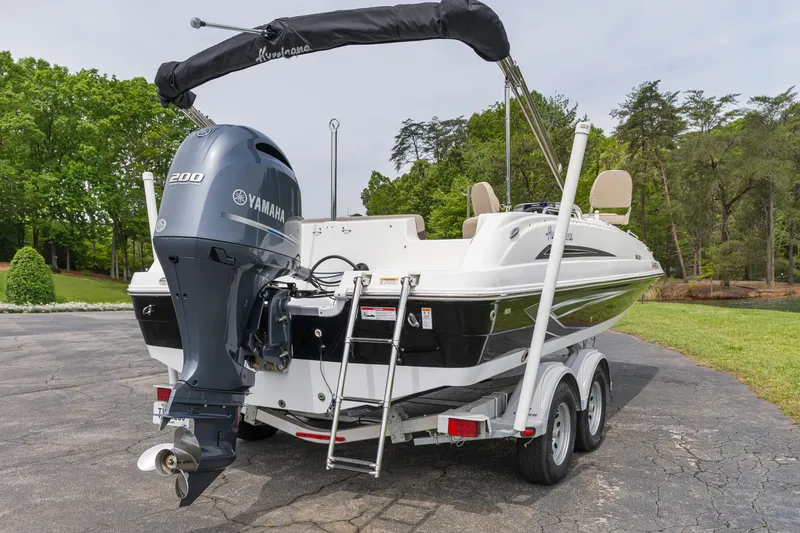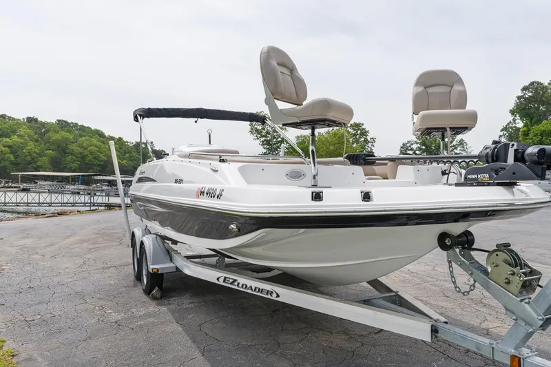 This popular model is like new. Only 40 hours on a Yamaha 200HP engine. This is deck boat primarly set up for fishing. Equipment includes two Hummingbird GPS/fishfinders, two forward deck mounted fishing chairs and a Minnkota Ulterra 80lb, self-deploying trolling motor with remote control. Boat can also be used as a bow rider for just family cruising with the bow cushions in place.The trailer is an Aluminum model with tandem axle and brakes. Boat can be used in either fresh or salt water although it has never been used in saltwater. Powered by a Yamaha 200 HP outboard provides plenty of performance and reliability. This boat is ready to fish or cruise with the family.