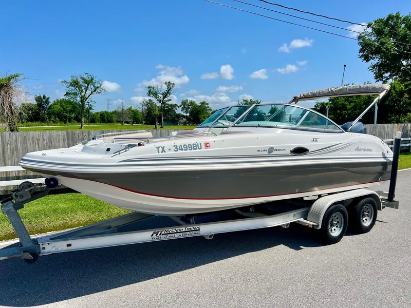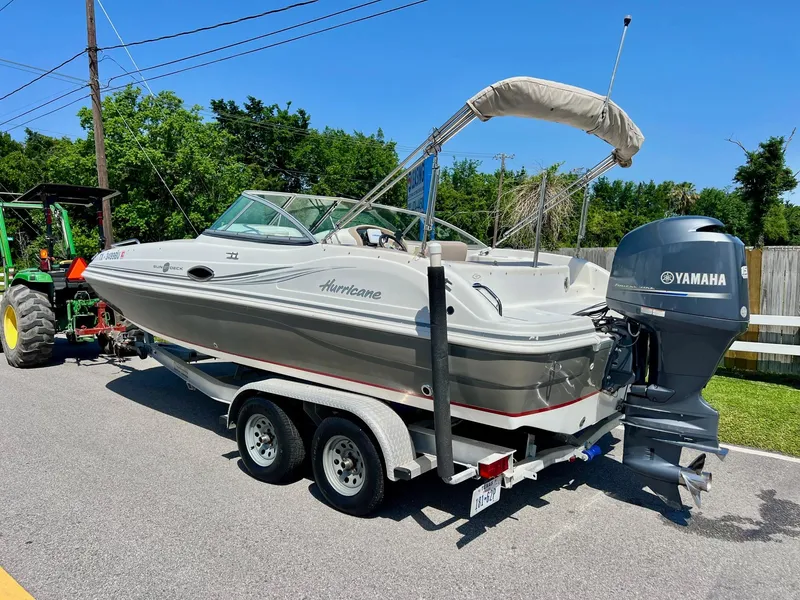2013 Hurricane Sun Deck 217 being pushed by a 2012 Yamaha 150hp 4stroke (40 HOURS!!) and is sitting on a McClain tandem axle aluminum trailer. This boat is rigged with the following options and accessories. Lowrance HDS5 GPS/FF, Dual Bluetooth Stereo w/speakers throughout, Yamaha analog gauges package, Sea Star hydraulic steering, labeled switch panel, transom boarding ladder, Ski pylon pole, bimini top, L shaped rear bench seat, freshwater sink, snap in removable carpet, captain swivel bucket seat, enclosed privacy/storage space, full walk through windshield, bow seating w/storage underneath, bow livewell, anchor locker, deck lights and navigation lights.