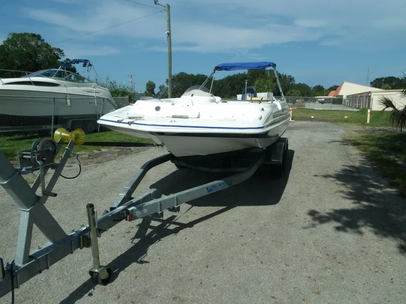 Features include transom shower, fore and aft swim ladders, transom cooler, under seat storage, Garmin GPS and a Sony stereo. This is a great boat for entertaining or for family fun in the sun. There is a Bimini top to offer shade and all the cushions are in good shape. If you are looking for a deck boat, you should check this one out!