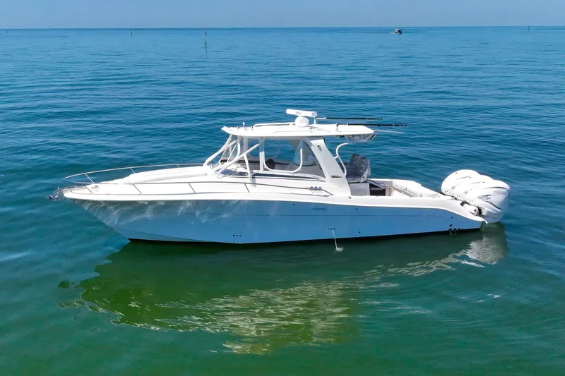 This 2008 Hydra-Sports Vector 3500 VX is a remarkable saltwater fishing and cruising vessel that combines performance and style. With an impressive overall length of 34.83 feet, this boat features a robust fiberglass hull designed in a deep Vee shape, ensuring stability and agility on the water. Powered by three Yamaha 425XTO outboard engines, this vessel promises exhilarating speed and efficiency, with only 143 hours of use.