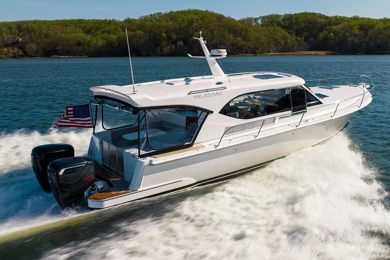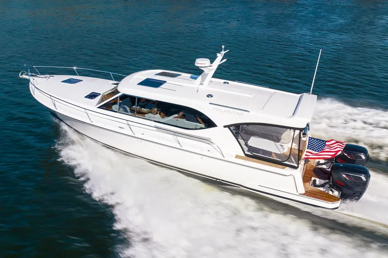 Spacious, fuel-efficient, with plenty of power, and exceptional craftsmanship as you should expect from a Hylas power yacht. One level of comprehensive entertaining from the helm station to the swim platform. The new Hylas M47 exudes the finest handcrafted quality and attention to detail. Relax in the luxurious salon or enjoy alfresco dining or lounging in the covered spacious cockpit. Rooftop storage for the dinghy, paddleboards, or kayaks. Perfect for the family. Experience the proven performance, economical cruising, and quality craftsmanship of Hylas Yachts.