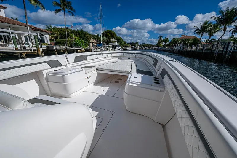 A pristine, high-performance offshore center console with exceptional design and capability. Powered by Triple Yamaha 425 XTO outboards, this 40' Intrepid delivers incredible acceleration, smooth offshore handling, and serious fishing or cruising versatility. The Front Entry layout provides excellent access to a full head compartment, spacious helm area, and open cockpit. Built with vacuum-infused foam-cored fiberglass and Intrepid's signature deep-V stepped hull, it's engineered for comfort, fuel efficiency, and performance. Extensive storage, fishing features, premium seating, and optional electronics make this boat as functional as it is luxurious.