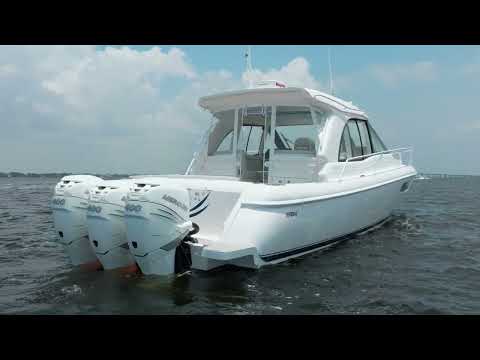 An exquisitely crafted byproduct of 30 years of evolution and 2 years of design, the 410 Evolution has pushed the class of high-end yachts to a new unchartered plateau. This is a 41.19-foot display of power, stability and maneuverability with its revolutionary step hull design and triple outboard engines that don't sacrifice an inch of cockpit space for performance. The cockpit itself features an electronic sunroof, and perfectly sculpted and innovatively designed helm seating that converts to create more open seating and conversational space. For diving and swimming, an integrated hullside dive door with a foldout ladder is located starboard. Relax in a cabin adorned with a queen berth mattress, custom u-shaped settee, a stainless steel refrigerator/freezer, electric cooktop and microwave with wood veneered cabinetry throughout. There is even an electronic dinette with wooden surface that lowers to create an additional berth.