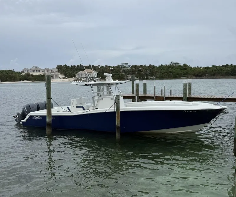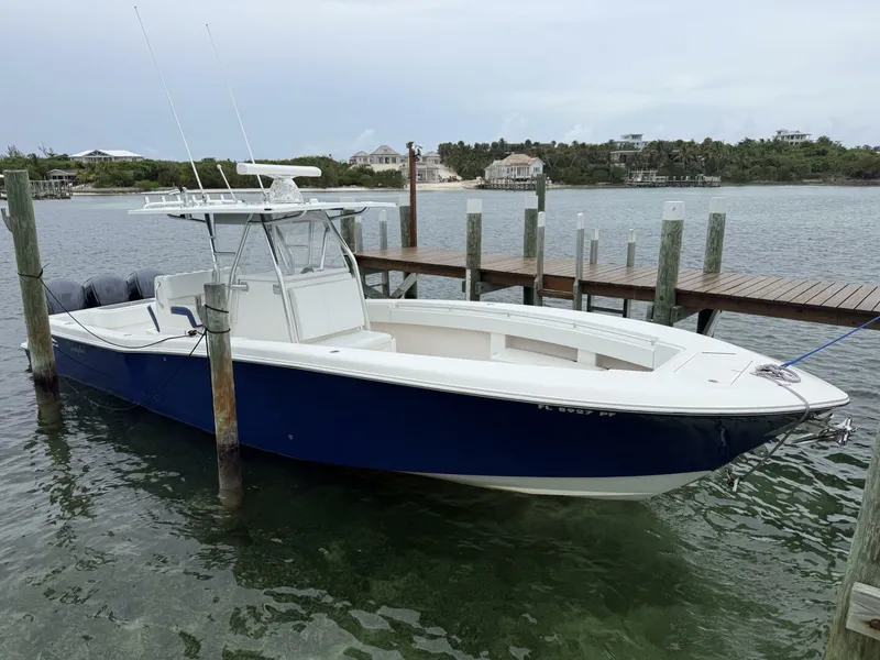 Stepping onboard the vessel you see the beautiful deep blue hull. Boarding from the bow you have a U shaped seating area with 4 large lockers. Moving down towards the console there's a bow facing seat. At the console there's a large deep captain seat with a deep storage reverse facing seat to the aft. The console is wrapped with screens to keep the wind out and is equipped with Garmin electronics, JL audio system, dual ICOM VHF, bow thruster, trim tabs. There are lockers throughout the boat going towards the aft. At the aft there are two seats port and starboard of the live well. The vessel is powered by Triple Yamaha 300 V6, with low hours. The engines have had a full service done last season.