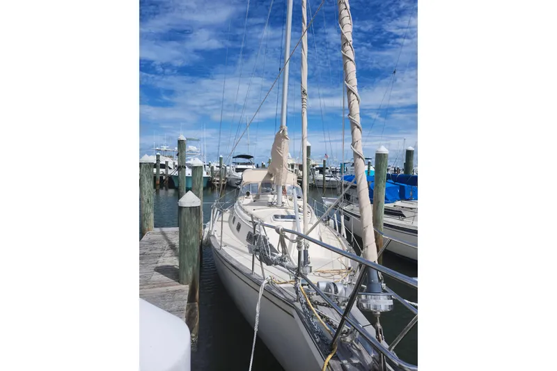 With classic good looks, exacting craftsmanship, and reliability and trouble-free service second to none, the Island Packet has become an unequaled choice for knowledgeable cruising sailors. Island Packet's full keel unifies the performance with superior safety and adds several benefits for the cruising sailor: superior protection from damage for both rudder and propeller and enhanced steering qualities unique to a long keel configuration. Topside continues the Island Packet tradition of an unobstructed deck. Full-length cabin top handrails and a recessed foredeck help ensure both safety and security while underway. The platform extends the sail plan forward, adding extra sail area, allowing for closer sheeting angles when sailing to windward. The manageable and versatile cutter rig allows a small crew to set a variety of well-balanced combinations in a wide range of wind and sea conditions. The genoa and self-tending staysail are fitted with roller furling systems. Control lines lead aft to allow routine sail-handling from the comfort and security of the cockpit. The premium rack and pinion steering system further adds to the safety and enjoyment of this cruising yacht. Below decks the focus is on the requirements of cruising and a comfortable lifestyle aboard. Varnished teak and holly adds to the living areas. The main salon can be an open salon area or with the bulkhead-mounted table folded down, an accommodating dining area. The port-side settee slips out to form a double bunk. The galley features counter space, stainless steel sink, a well-insulated ice box and propane range. The head includes a shower. The engine system is engineered to provide years of trouble-free service. Island Packet hulls, molded of solid triaxial roving, offer superior impact and puncture resistance compared to conventional roving's or cored construction.