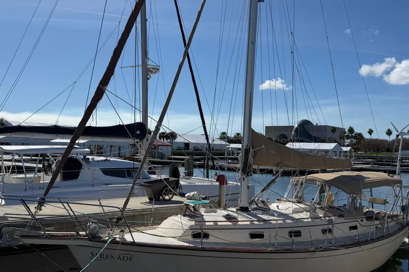 Serenade is cutter rigged with an extruded aluminum keel stepped mast and boom. She has all lines led aft to the cockpit for safety along with single line reefing for the main.