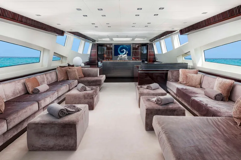 ANTELOPE IV features expansive exterior deck spaces, including a large sunbathing area, dining space, and lounging areas that provide ample room for relaxation and socializing. The sun deck is particularly notable, with a jacuzzi, bar, and additional open space for sunbathing or outdoor dining. The interior layout is an open-plan, with large lounges, dining area, and full-height windows offering beautiful views of the sea. The yacht's design emphasizes modern luxury, with minimalist but functional decor.