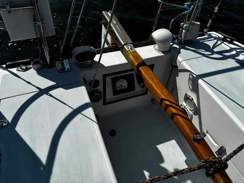 Sleeps six adults (2 V-berth, 2 main cabin, 2 aft quarter berths), operating head w/tank, refrigeration, hot and cold water pressure, shore power, new dodger ('05), fuel tank replaced ('06), teak and holly cabin sole, dual burner propane stove, Magma propane bbq grill.