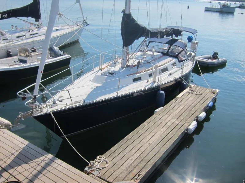 Owners Cabin: The forward cabin sleeps 2 in 6’ 2” V-berth with king width custom mattress and bedding (2006). Teak sliding door storage cabinets, port and starboard above V-berth, are a factory installed extra, as is a deck prism for extra natural light forward, but shades also provide for complete darkness when desired. A bureau and large hanging locker is to starboard, and private head with shower to port.