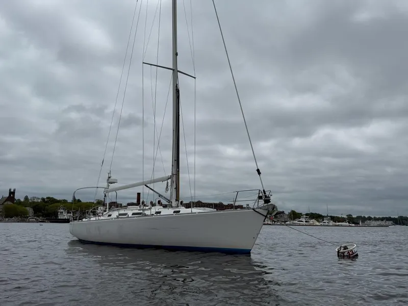 The elegantly appointed interior, with finished satin varnished cherry, is graced with live aboard conveniences throughout. The layout features a well-organized and well thought out settee and dining area with convenient cherry wood fold up dining table. Well organized L-shaped galley, forward & aft staterooms, forward & aft heads, large navigation station blends an excellent compromise between practical and working space and comfortable living quarters.