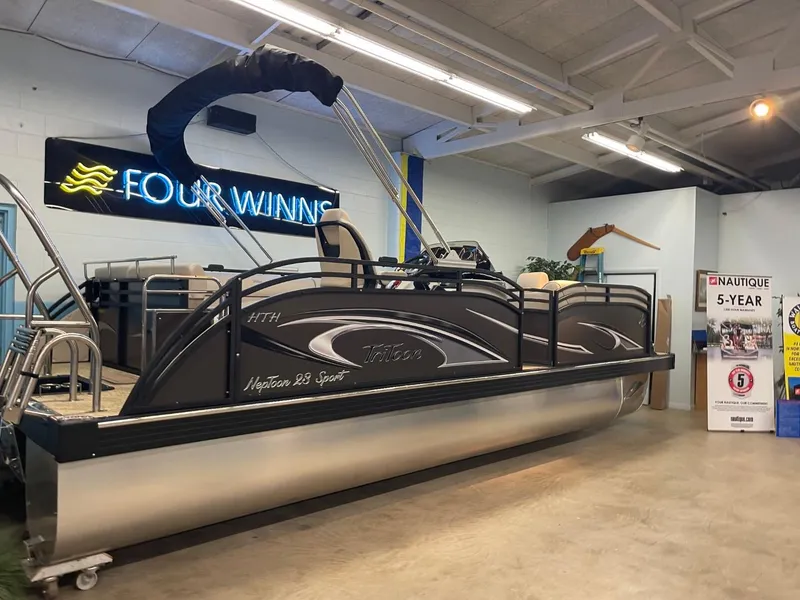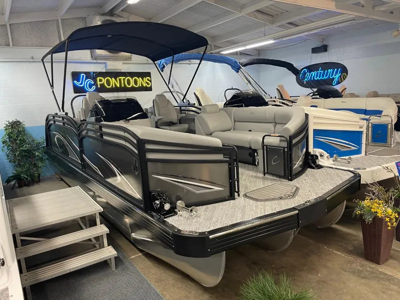 2025 JC NepToon Sport DSL TriToon, HighTideHull with infloor ski locker and in floor anchor locker, performance lifting fins, hydraulic steering with power assist, power bimini, plank pattern vinyl flooring, tip out trash with glove box above with USB charging port, raised driver's helm, wireless charging, Fushion Stereo with Bluetooth and upgraded speakers, oval table, fender holder w fenders stern boarding ladder, depth finder, docking lights, full Sunbrella cover and docking lights, and RGB exterior under trim lights.