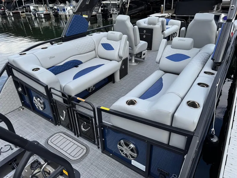 New 2025 Features: 9" Garmin color GPS/depth finder/fish finder nested in the newly redesigned helm, New Digital Gauges, Blackout rubrail, bimini, gates, and ski tow, Fusion Stereo with 8.8 RGB multi-color backlit speakers inside and aft deck, RGB under-trim exterior lighting, RGB underwater lighting, RGB interior courtesy lighting, all new rail pack design, new and improved Captain's chair with flip-up bolster, wireless cell phone charging station in the helm next to throttle, New lounger storage with slide-out drawer and USB charging shelf on both rear lounges, New lounger with trash container and lockable USB charging shelf storage, New High Tide Hull rubrail design, New textured powder coating on the rail pack, and improved Nouveau accent upholstery.