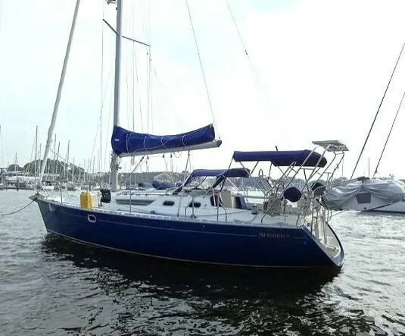 Forward stateroom with V-berth, vanity sink hanging locker and storage lockers. The salon has a dinette to starboard side and a settee opposite to port. Further aft to port is the nav station and further aft is the head compartment with electric toilet, vanity and shower. Opposite to starboard is the L-shaped galley. Further aft to starboard is the master stateroom with a queen sized berth with custom mattress. The interior has a nice wood cabinetry, a teak & holly sole, four overhead hatches and 5 opening ports. LED lights in main cabin. Fans installed in main cabin, V-berth and aft stateroom.