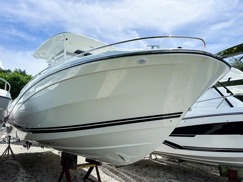 The 2024 Jeanneau Leader 9.0 CC is a versatile 29-foot center console that seamlessly blends sport fishing capabilities with family cruising comfort. Designed for up to 11 passengers, it features a spacious cockpit with an optional aft galley or fishing station, a T-top with seating for three at the helm, and expansive sunbathing areas in both the forward and aft sections. Below deck, the cabin includes a double berth, separate head and shower compartments, and optional air conditioning-making it one of the few center consoles in its class to offer overnight accommodations.