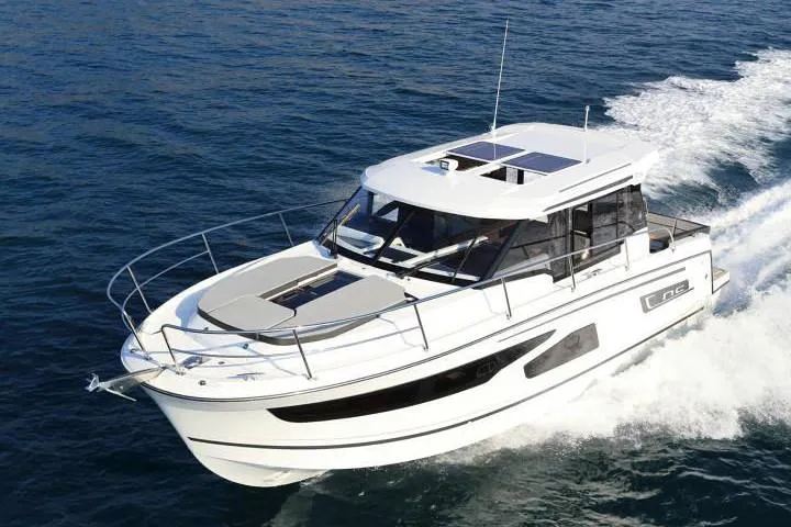 Like all Jeanneaus, the NC 1095 has been designed for life underway and includes features like recessed side-decks allowing for safe movement about the boat with easy access to the helm. A large L-shaped lounge comfortably fits a large group and easily converts into a large lounging area. Large transom platforms on either side of the outboard engines, make boarding safe and easy.