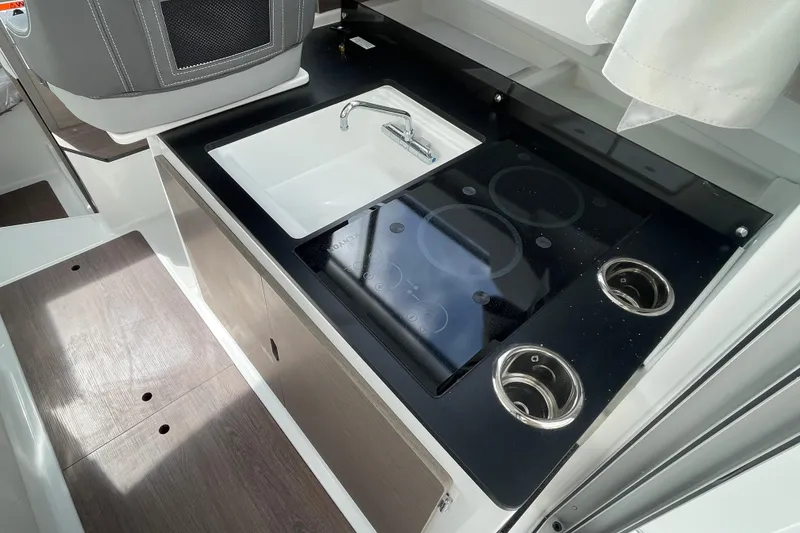 Docking is simplified with the bow thruster and pre-rigged Yamaha 250 package. The starboard side boarding gate and oversized swim platforms make loading coolers, paddleboards, or guests at the marina controlled and predictable. An electric windlass with helm control reduces physical strain when anchoring at Egmont Key or sandbars.