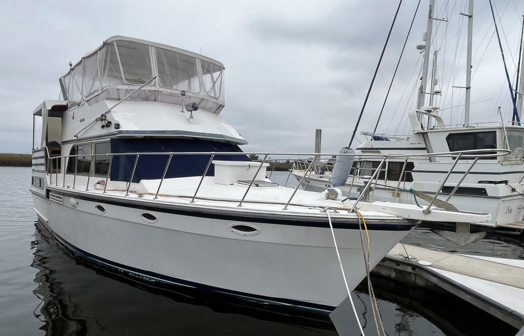 The foredeck is safely and easily accessed from either side of the vessel through wing doors from the aft deck and onto sidewalks. These sidewalks allow side boarding of the vessel and also feature stainless steel railings, non-skid decking and stainless steel handrails. The foredeck includes: blue snap-on side window and windshield covers, low-mounted cabin top hand-hold railings, two double stainless steel fender storage racks, foredeck hatch to the forward stateroom, self-draining chain locker, electric windlass with foot controls, fiberglass bow pulpit with integrated anchor roller, an anchor rigged to the windlass, and a foredeck wash down spigot. There is also a storage deck box, a spotlight, and horns. The two 30amp cords can be plugged in on either the port or starboard sidewalks for convenience.