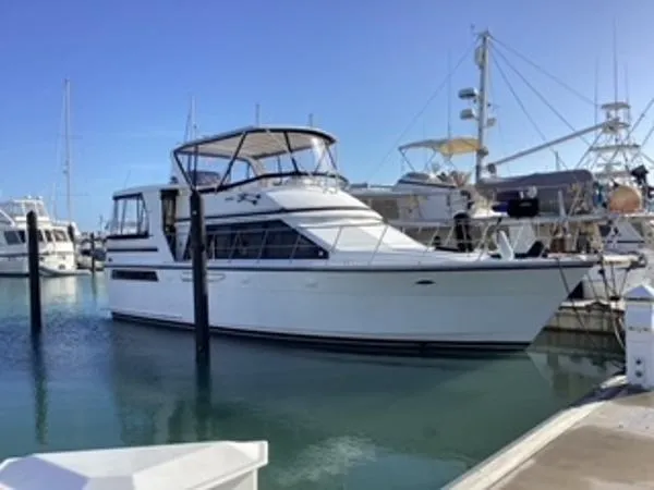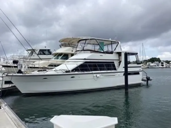 A great looking boat with a roomy interior layout that combines a lot of space into a 46 ' boat. She features mid level U-shaped galley with over counter, eye level, stainless refrigerator and freezer, great counter space and storage and aft in the salon and a breakfast bar with 3 bar stools and overhead galley storage separates the galley from the main salon, both staterooms are spacious� with the master aft with a centerline berth and plenty of storage and the ensuite head includes a tub. The guest stateroom is forward and features vee berths with it's own head. The guest head also serves as the boat's day head with private access from the forward cabin and also access via the companionway.