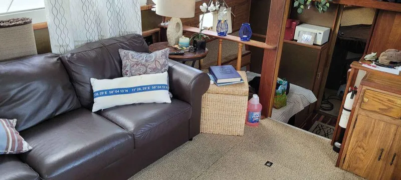 Owners Stateroom forward with double bed. Head with stall shower to stbd. Salon has sofa to port & 2 chairs to stbd. Convertible dinette down to port opposite Galley.