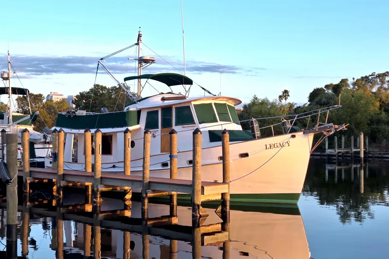 1980 Kadey-Krogen 42 Trawler "Legacy" is a legendary long-range cruiser known for efficiency, safety, and classic Kadey-Krogen craftsmanship. Ideal for the Great Loop, island cruising, and extended passagemaking, she is powered by a 120hp Ford Lehman diesel (replaced 2014) with a 6kW Northern Lights generator, offering economical, reliable performance.