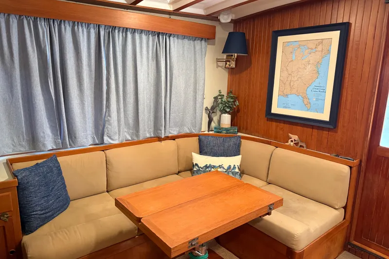 The saloon is entered through double teak doors from the spacious covered aft deck. The aft deck is large enough for conventional porch furniture. There is a retractable screen to provide fresh air without the bugs. There is an L-shaped dinette with hi-lo table to starboard. To port are two comfortable chairs. To port ahead of the chairs is a built-in storage and shelving cabinet. For entertainment the saloon features a flat screen TV, Blue Ray player and stereo. Carpet protects the teak parquet floors. Two large windows with teak valences and black-out curtains (2025) to port and starboard provide light and a nice breeze when at anchor.