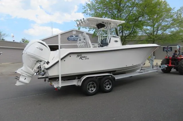 New just arrived 2025 25 Bay Rider By KenCraft Offshore Model. Their motto is "Quality is our Promise" and it shows when you step aboard this stunning, roomy 25 foot center console. An impressive beam of 8'9" this will be the steady ride you and the family are looking for. Dry weight of 4600 pounds and 160 gallons fuel capacity this boat can enjoy back bay or offshore distance fishing. Powered by twin Yamaha 200 hp Outboards you will have great fuel economy and a quiet ride. Coming through the transom walkthrough you find a folding bench seat and an oversized live-well with recirculating aerator. Under gunnel rod storage on port and starboard sides. Behind twin Captain helm seats you will find storage drawer, large cabinet and a designated garbage can drawer and 4 rod holders.. Sliding Captains chairs with folding bolsters w/ folding armrests. 4 cup holders at helm with a Wet Sounds MC-20 Head Unit. Wet Sounds amplifier and speakers throughout boat and on hard top. Equipped with Dual GPSMAP 1243xsv Touch plus Digital Switching, CL5 Guage, NMEA, Matte Dash, Yamaha Integration, EKS Keyless Remote, Push Button Start. Large in deck fish box in bow and storage lockers under bow seating with removable back rests. Accon pop up LED Bow Light and 6 Accoon 8" stainless pop up cleats. A fisherman's dream of 22 rod holders on the boat. Under Helm compartment for porta potty and lots of storgae needs.