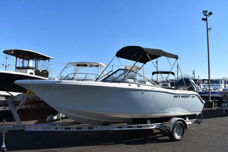 For Sale by Diamond Marine of Connecticut, a Key West dealer. This 2025 203DFS Dual Console was ordered with the following optional equipment, Ice Blue hull color, Yamaha F150 Four stroke outboard, stainless steel prop, hydraulic cylinder Seastar steering, Premier Fog interior, Yamaha command link gauges, Garmin 943XSV Touch GPS w/ transducer, stainless steel rubrail, stainless steel framed black bimini top w/ boot, Bow cover, cockpit cover, walk-thru curtain, Interior LED Lights, Underwater lights, Bow table w/ filler board, Popup fender holders, portable toilet. Trades welcome, financing available, discounted shipping if needed.