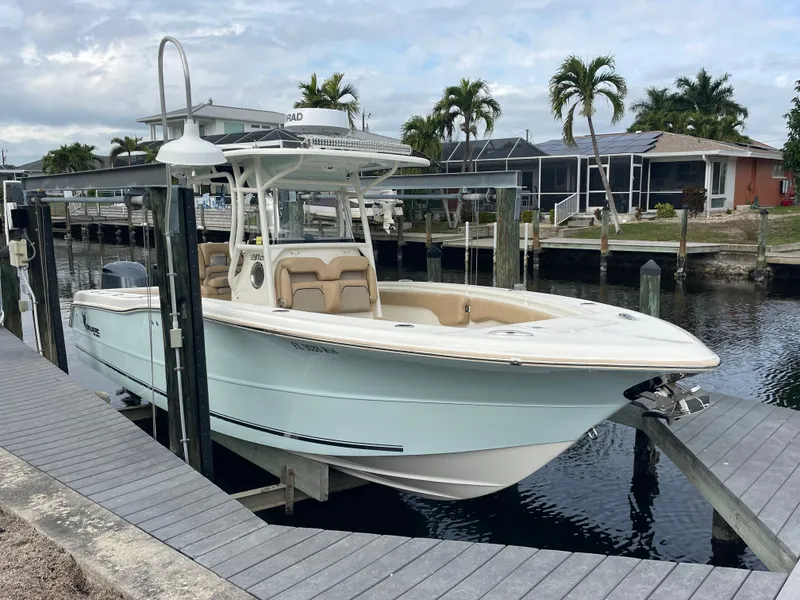 Powered by reliable professionally maintained twin Yamaha 300HP outboards with stainless props and a top speed near 60 mph. Features include joystick control, dual Simrad chartplotters, radar, autopilot, Simrad VHF, Bennett trim tabs, electric windlass with stainless anchor, livewell, freshwater sink, raw and freshwater washdowns, underwater lighting, forward bow flood lighting, and an enclosed electric flush head.