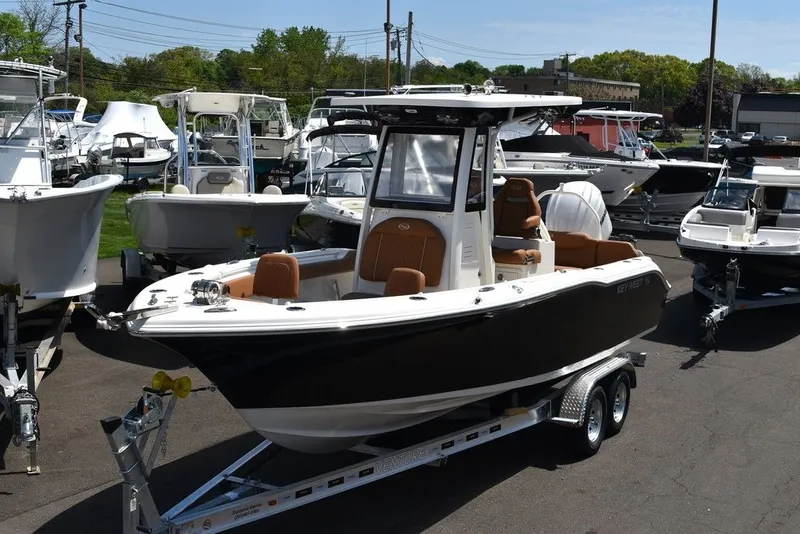 For sale by Diamond Marine of Connecticut, a Key West dealer. A New model, 239FSR Center Console boat and motor package. The FSR is a premium version of the wildly popular 239FS that has been our best seller for years. We ordered this one with a Yamaha F300 White DEC (Digital electronic controls) DES (Digital Electronic steering), Black hull, Premier caramel interior, CL5 Yamaha gauge, White powder coat, Accent in black underside of hardtop, Garmin 8612 GPS/Fishfinder 12 inch touch screen, VHF Radio, Leaning post cover, Console cover, Ski pole, pump-out toilet, and windlass anchor. Financing available, local trades welcome. Boat can be seen 6 days a week at our East Haven store. Contact us by email or phone at 203 466-5384 for more details and ask for Mark or Karl.