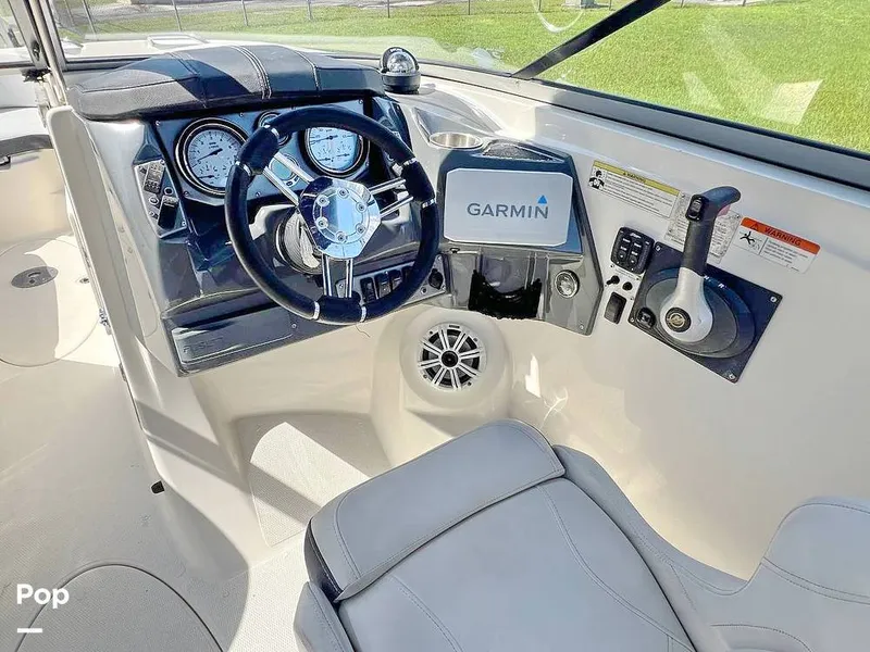 Comes with a blue fold-down bimini top. The helm houses a Garmin GPS, Lenco trim tabs, and a Fusion stereo system. It has a full sunpad aft with a complete swim platform and ladder. The boat comes with a full cover.