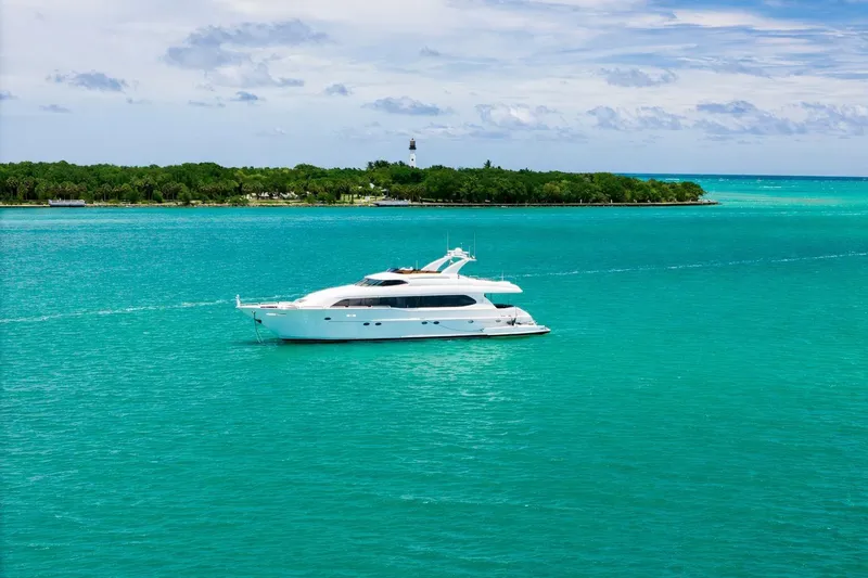 Contemporary raised pilothouse styling with a gorgeous and very spacious interior, this stunning Lazzara 'Tranquility IV' provides an unparalleled cruising experience. In 2023 she underwent a massive refit updating her interior to 2026 standards. In addition she recent received her UPV allowing worry free charters and safety features to the highest standards. With 23' beam and 4000 gallons of fuel, she is capable of straight voyages north or south on Florida coastline with exceptional comfort. She is also the perfect vessel for cruising the Bahamas. There are three staterooms, as well as a private den/study which can comfortably sleep 2 extra guests, for a total of 8 in the owner's party. This extra room was available from the factory as either a study or a fourth stateroom with head and can easily be converted back to a stateroom. Her features include a spacious flybridge with jacuzzi, bar and grill, a raised pilothouse with excellent sight lines; elegant salon & spacious aft deck, transom pods with wave runners, & full beam stand up walk around engine room. Tranquility IV has a huge country kitchen style galley with a large U-shaped dining table. Forward is the two stateroom, two head crew quarters. The decor theme is accentuated by a hi-gloss cherry wood treatment, which is found throughout vessel. Interior updates in 2014 include a 100% new padded ceiling panels on both levels, done by Lazzara yachts