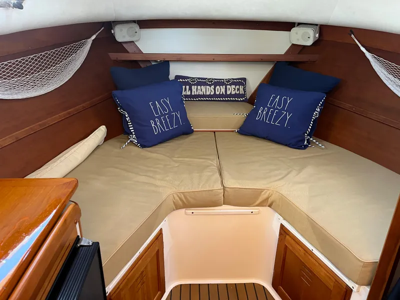 The private head with door is to starboard and features an electric toilet, sink with faucet/shower and multiple storage lockers in and above the vanity. To port is a galley. In the cabin, four large opening ports with screens and a large overhead deck hatch provide excellent ventilation and light below.